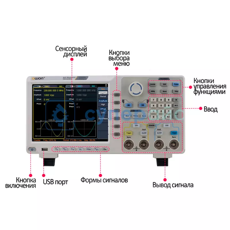 Произвольная форма сигнала | Sinc, экспоненциальный рост, экспоненциальный спад, электрокардиограмма, Гауссов импульс, полуположительный, Лоренц, двойное аудио, постоянное напряжение — всего более 150 видов. |