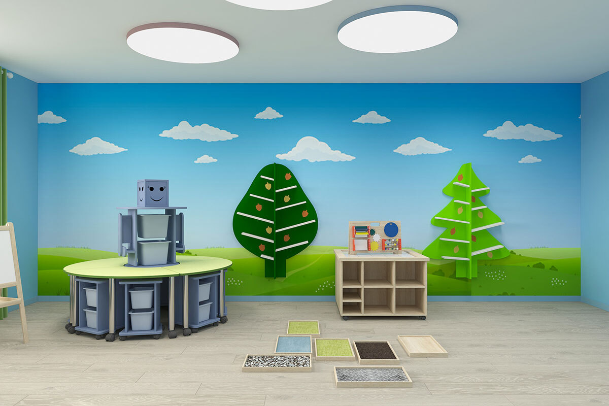 Комплект полностью собран под ключ. Он включает в себя удобную и практичную мебель, игровые компоненты, дидактические инструменты и пособия для развития социальных, психологических, творческих, интеллектуальных и моторных навыков малыша. Особенности