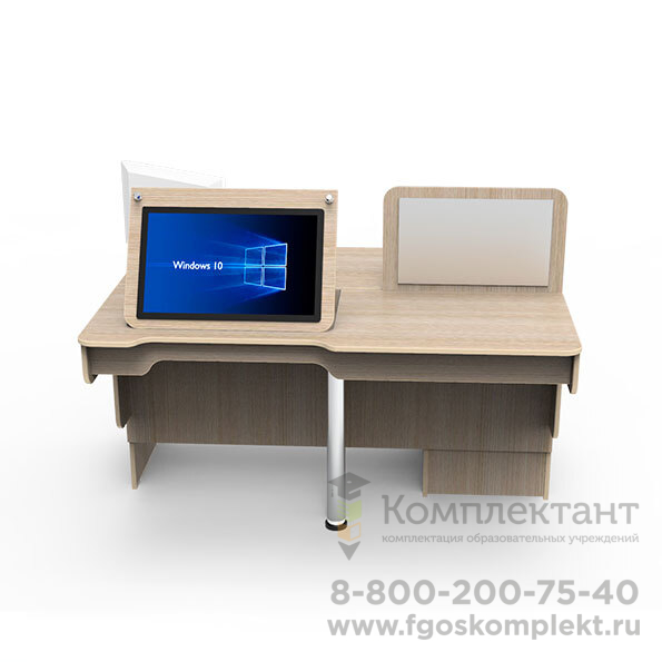 Стол психолога-дефектолога изготовлен в виде классической корпусной мебели с вмонтированной интерактивной системой и двумя рабочими местами. На рабочем месте профильного специалиста установлен производительный персональный компьютер с монитором, на месте клиента вмонтирован планшет с большим сенсорным экраном, поддерживающим до 10 одновременных касаний.