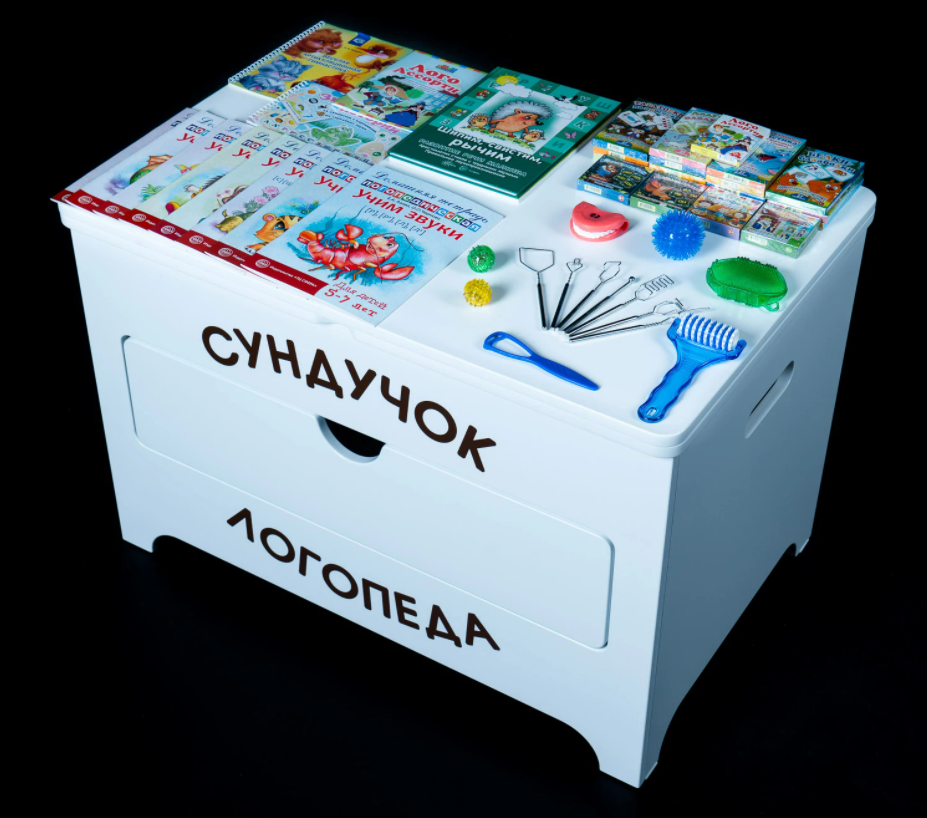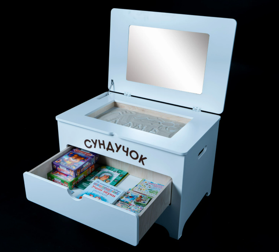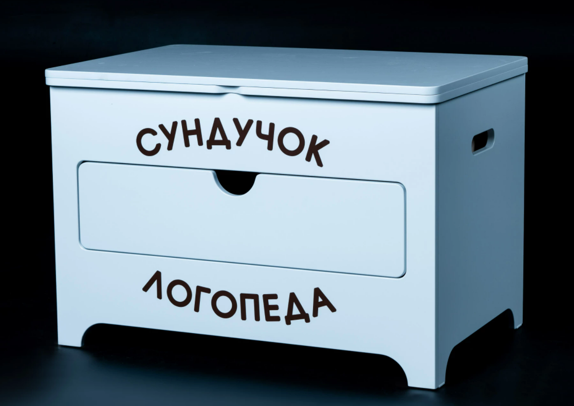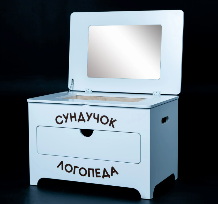Компактный сундучок специалиста логопеда для проведения развивающих занятий имеет встроенную панель для рисования песком с крышкой, легко превращающейся в рабочую поверхность.