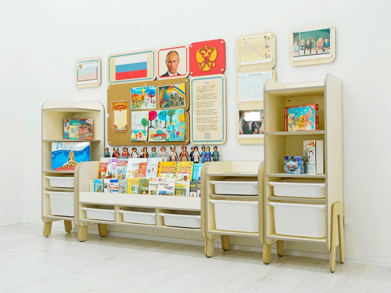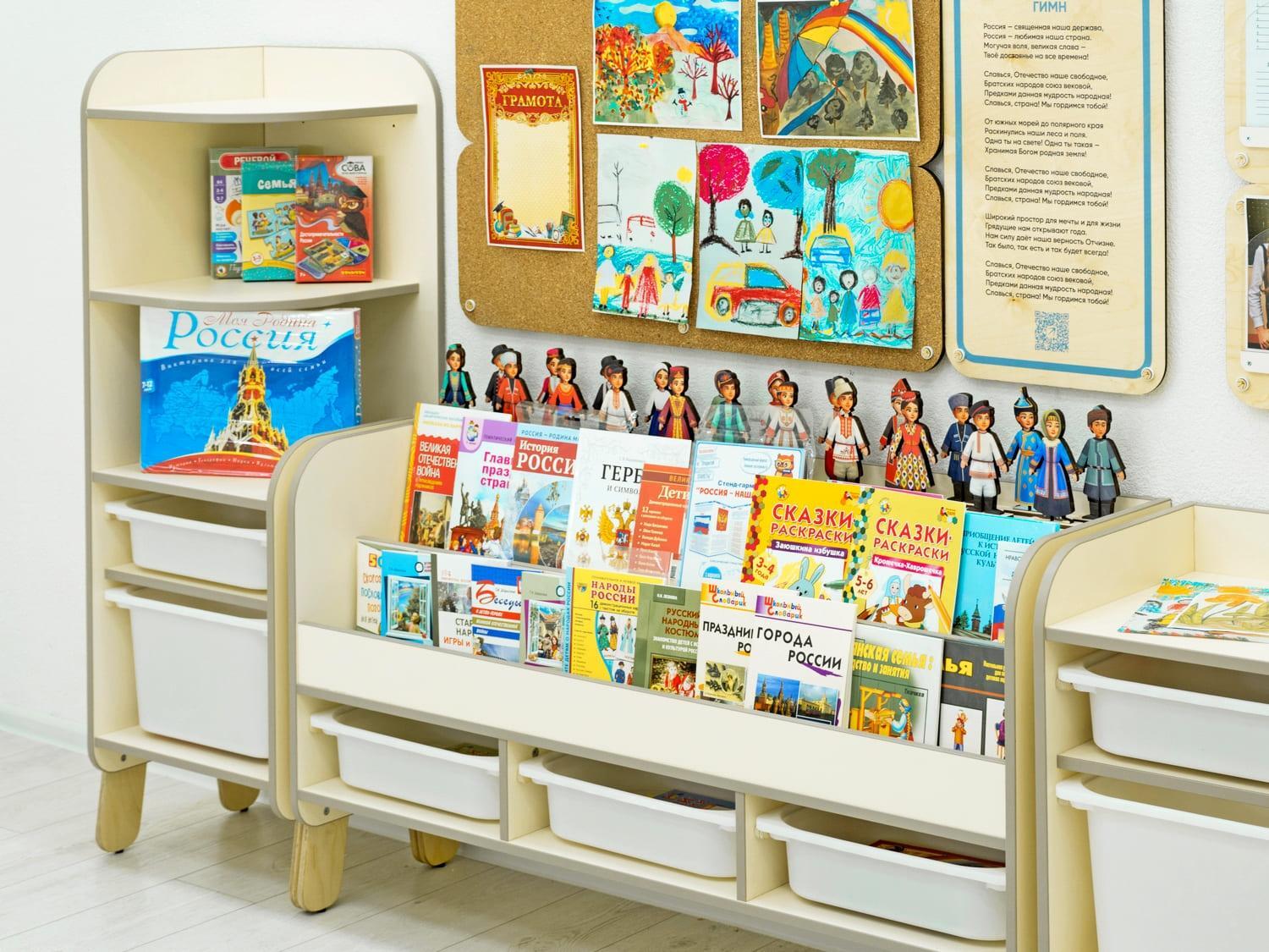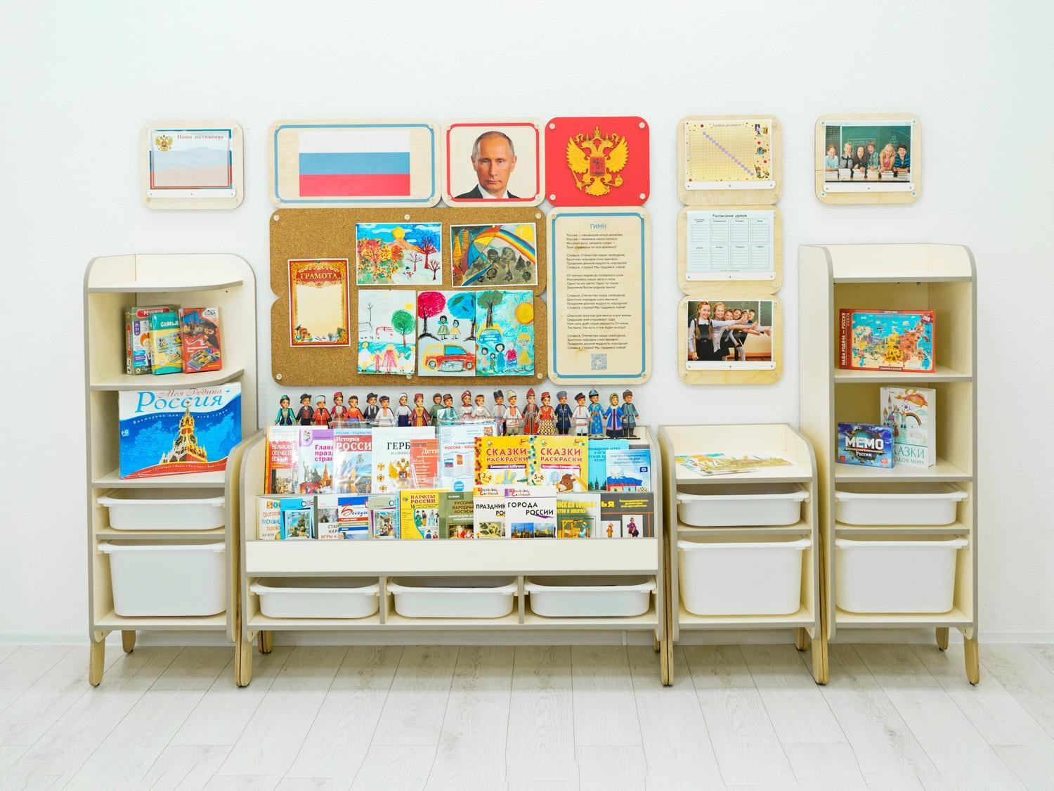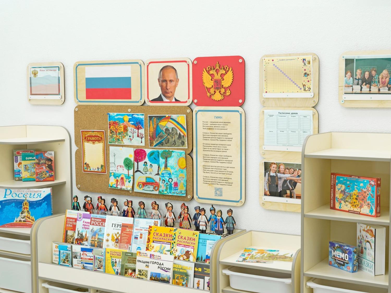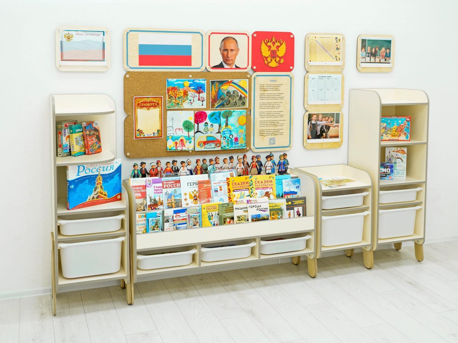 Нашими методистами собраны книги, раскраски и настольные игры для создания полноценного курса по патриотическому воспитанию. Удобные стеллажи с полками и ящиками содержат всё необходимое наполнение, чтобы проводить занятия с дошкольниками 3-6 лет. Акриловые рамки служат для размещения полезной информации: портрет губернатора, герб и флаг региона, национальный праздник или историческая личность, которую изучают юные воспитанники. На пустой пробковой панели можно легко размещать работы детей или распечатанный наглядный материал к уроку. Для изучения национального разнообразия России в комплектации есть куклы в народных костюмах (24 национальности, 48 кукол). Они выполнены из берёзовой фанеры и ДВП с нанесением принтерной печати. Куклы разборные: голова, торс и ноги надеваются на основу-подставку. Играя в них, дети могут составлять различные вариации одежды куколок - правильные и неправильные, искать пары, разыгрывать сюжетно-ролевые сценки, параллельно запоминая национальности и их традиционные костюмы. Технические характеристики: