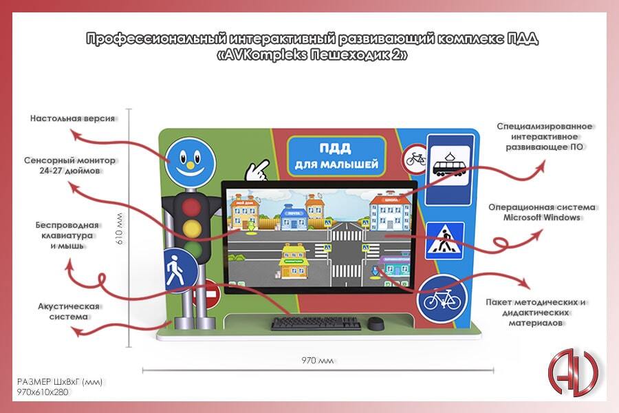 Профессиональный интерактивный развивающий комплекс ПДД «AVKompleks Пешеходик» представляет собой комбинацию технических, дидактических и программных средств для обучения детей школьного и дошкольного возраста Правилам дорожного движения. Можно проводить как индивидуальные, так и групповые занятия с детьми. Интерактивные элементы оборудования ПДД для детских садов делают процесс обучения увлекательным, что способствует лучшему запоминанию информации.