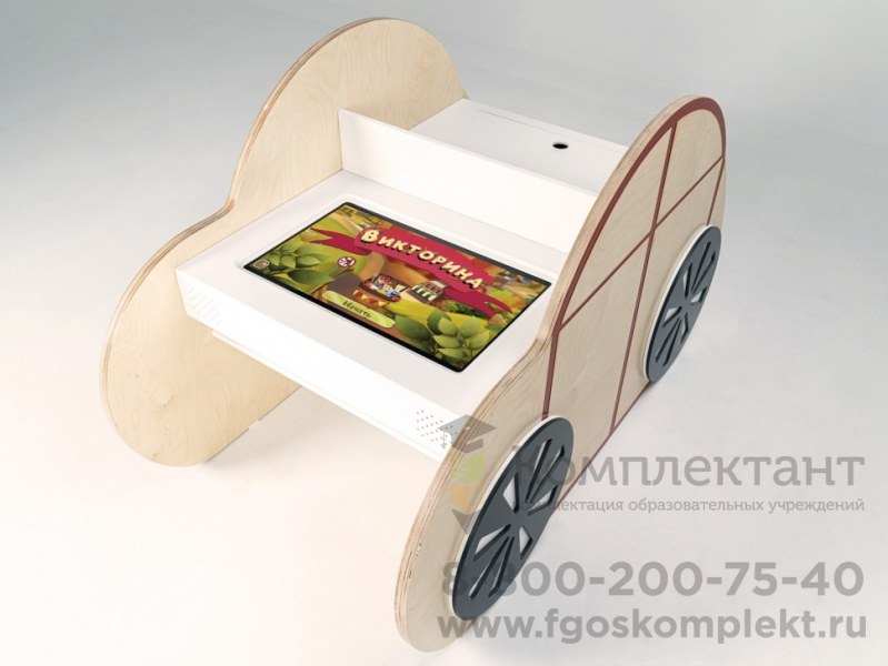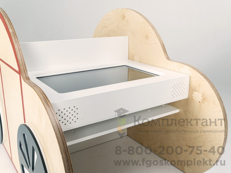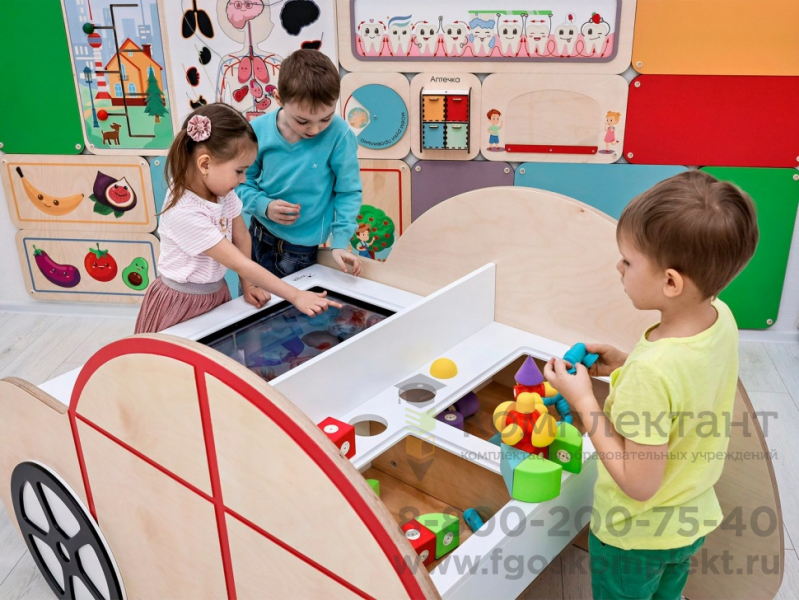 Методический интерактивный комплекс «Машинка» представляет собой многофункциональное игровое пространство с двумя зонами: зоной конструирования и интерактивной панелью для занятий.