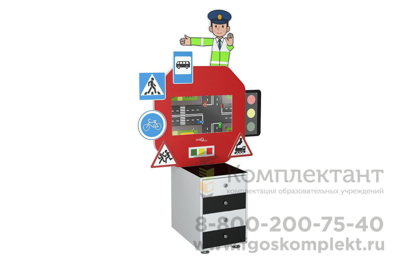Интерактивный развивающий комплекс «ПДД» изготавливается из безопасных экологичных материалов и оснащен выдвижными ящиками для удобного хранения дидактических и учебных материалов. Комплектуется основными знаками ПДД и работающей интерактивной моделью светофора.