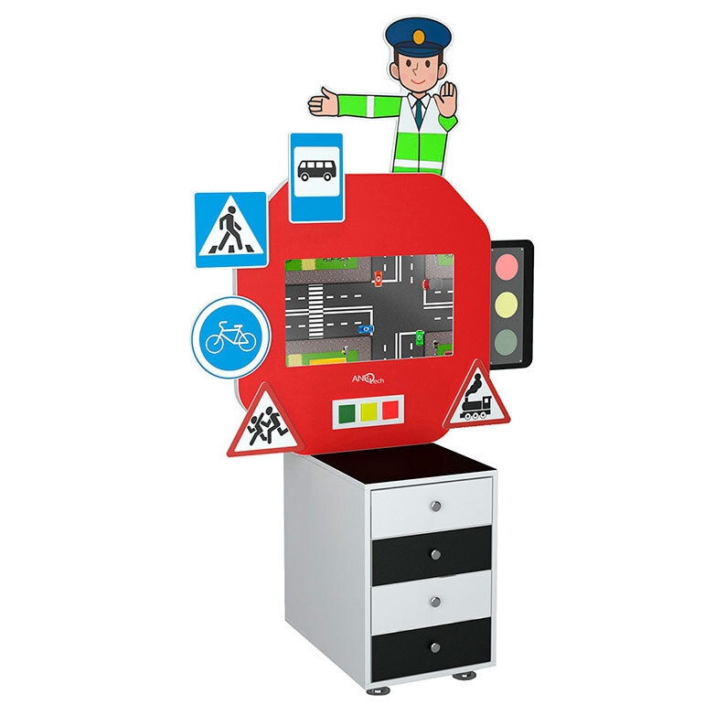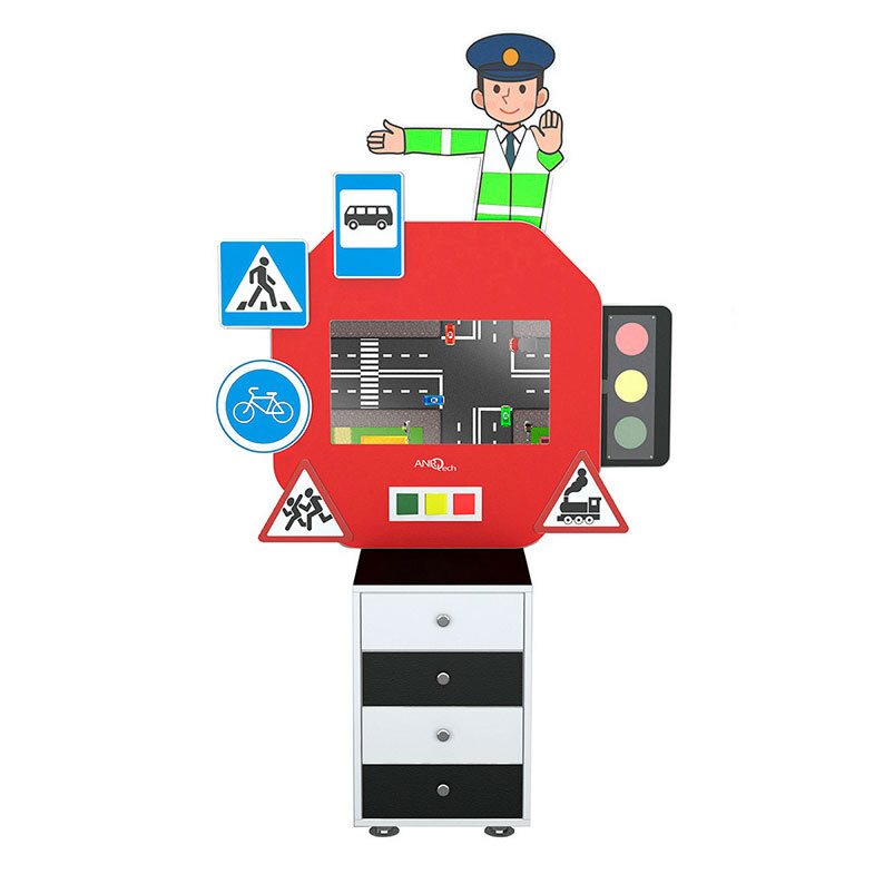 Интерактивный развивающий комплекс «ПДД» изготавливается из безопасных экологичных материалов и оснащен выдвижными ящиками для удобного хранения дидактических и учебных материалов. Комплектуется основными знаками ПДД и работающей интерактивной моделью светофора. Интерактивный стол по ПДД оснащен специальным программным обеспечением, нацеленным на организацию разносторонней работы с детьми по основным направлениям развития детей, определённым Федеральным государственным образовательным стандартом дошкольного образования (ФГОС ДО). Предустановленное программное обеспечение интерактивного комплекса ПДД включает набор игр-заданий для знакомства детей дошкольного и школьного возраста с правилами дорожного движения, а также основными знаками, его регулирующими, в том числе ПДД автомобилей, автобусов, поездов и т.д. Программно-аппаратный комплекс позволяет в игровой форме не только изучать правила дорожного движения, но и проводить тестирование, показывающее усвоение учебного материала. Программа с интуитивно понятным интерфейсом генерирует задания для юного пользователя, а после ввода ответа оценивает его знания. Изучение правил дорожного движения с использованием мультимедийного интерактивного модуля для изучения правил дорожного движения “ПДД” позволит ребенку понять, что их изучение - дело не только серьезное, но и совсем нескучное. Интерактивное оборудование по ПДД для ДОУ и школ обладает такими преимуществами, как:
