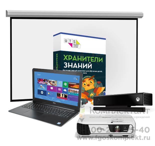 Комплект поставки: Сенсорный экран, Мобильная стойка на колесах, Сенсор движений, Пульт управления, Акустика, Компьютер, ПО «Хранители знаний», ПО «АЛМА», Коробка с ключами и болтами, Техническая документация.