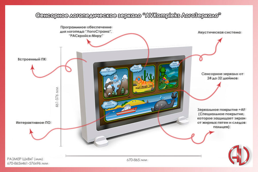 Игровой непринужденный формат занятий более привычен детскому восприятию, не дает им заскучать, мотивирует на дальнейшую работу. Яркие картинки на экране сменяются собственным отражением в зеркале, ребенок видит и контролирует свои действия: как шевелятся губы, в каком положении язык, он запоминает их правильное положение. Установленное программное обеспечение позволяет работать в безопасной компьютерной среде, проводить занятия по артикуляционной и дыхательной гимнастике, выполнять с детьми упражнения на автоматизацию звуков в словах и предложениях. Multi Touch System, поддерживающая до 10 одновременных касаний, позволяет проводить индивидуальные и групповые занятия, а функция субтитров дает возможность работать со слабослышащими детьми. Малогабаритные размеры делают оборудование мобильным, позволяют разместить его в любом, даже небольшом, помещении. Яркие, веселые картинки привлекут внимание ребенка, сделают занятия интересными и увлекательными. Во время занятий можно отключить экран, тогда ребенок будет видеть свое отражение в зеркале, где только что были сказочные персонажи и мультяшные герои. Такое волшебное путешествие по зеркальному миру безусловно увлечет ребенка, сделает занятие незабываемым и привлекательным. Установленное ПО разработки компании «АВ Комплекс» и других российских производителей внесено в Единый реестр российских программ для ЭВМ, имеет сертификаты соответствия. В комплектацию входит большой пакет методических рекомендаций для логопеда, а также набор карточек для автоматизации и дифференциации звуков. Преимущества