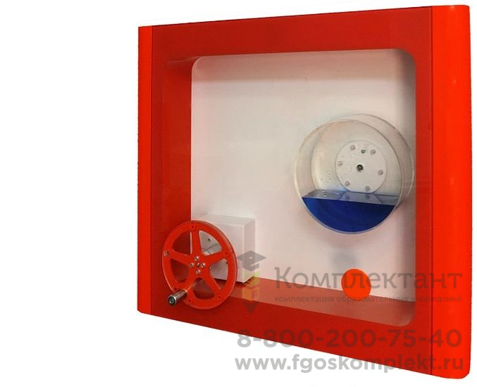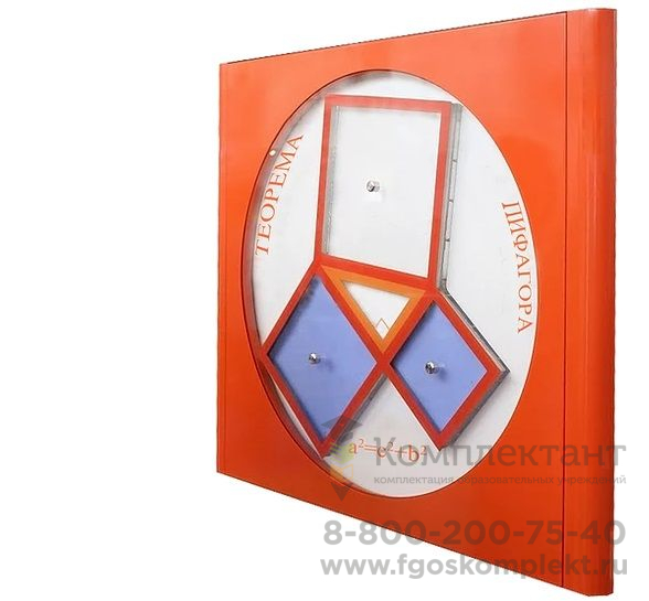 Принцип действия: данная учебно-демонстрационная модель наглядно демонстрирует Теорему Пифагора. Пользователь поворачивает диск модели таким образом, чтобы жидкость перетекла полностью из большого квадрата в два малых или наоборот.