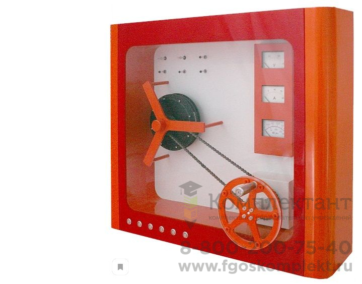 Принцип действия: ученик, вращая генератор, наблюдает, как меняется усилие вращения генератора, интенсивность свечения ламп и показания амперметра и вольтметра в зависимости от типа и количества подключенных к нагрузке ламп.