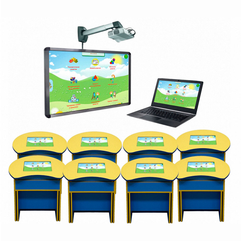 Интерактивные парты: Рабочее место педагога: Интерактивный комплект: Отдельно стоит отметить компактность интерактивного класса. Благодаря скромным размерам и мобильности интерактивных парт, интерактивному классу не нужно отдельно помещение. Классу найдется место в самом маленьком уголке группы детского сада или класса начальной школы. Есть интерактивная доска? Просто добавьте парты! Если у вас уже есть интерактивная доска, проектор и компьютер педагога, можно использовать имеющееся оборудование для подключения интерактивных парт и создания полноценного интерактивного класса 21 века.Для педагога:
