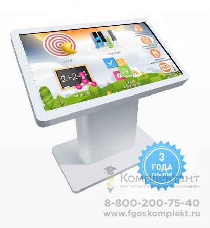 Закругленные углы, Защитное стекло на экран 4 мм, БЕЗУПРЕЧНАЯ реакция на касания, Низкое энергопотреление, В поставке руководство пользователя, паспорт изделия, сертификаты, кабель питания, РАЗМЕР - 65" - 1550*924*880 мм