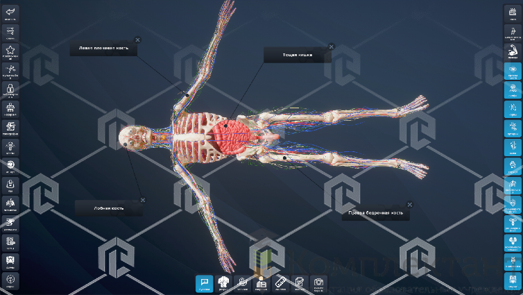 В программном комплексе имеется анатомическая классификация объектов. Объекты можно изолировать, чтобы рассматривать их отдельно от остальных. Объекты можно делать полупрозрачными, а также создавать собственные сцены из определенного сочетания объектов или систем в разных режимах. Комплекс позволяет включать и выключать метки на объектах, отображающие названия отдельных деталей объекта. С помощью специализированных виртуальных инструментов в режиме виртуальной реальности возможно изучение срезов организма секущей плоскостью.