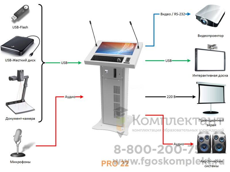 Комплектация трибуны Smartone PRO22 позволяет выступающему быстро и удобно задействовать всё оконечное оборудование аудитории: без пульта включить проектор, поднять или опустить экран, регулировать громкость акустических систем, вносить графические комментарии в транслируемый материал, не отходя от своего рабочего места. Состав трибуны:
