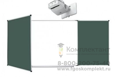 Интерактивная трёхэлементная доска с поверхностью для мела Innovator Board (5 рабочих поверхностей: интерактивная мультитач доска на 10 активных касаний и 2 двухсторонних элемента зеленого цвета для письма мелом); ультракороткофокусный проектор Optoma. В стоимость включена установка и доставка.