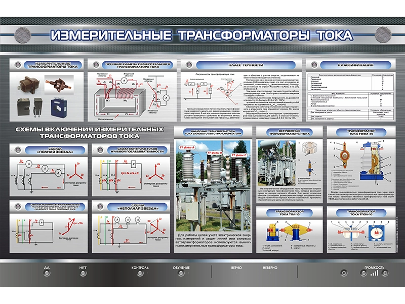 Электрифицированный стенд представляет собой информационную панель с комбинированной световой индикацией. На передней панели стенда размещена информация о видах, составе и конструкции различных измерительных трансформаторов тока и приведены краткие характеристики каждого вида с векторными диаграммами, иллюстрирующими работу типовых схем соединения трансформаторов. В конструкцию учебного оборудования интегрированы высокочувствительные сенсоры для управления стендом при помощи интерактивного магнитного воздействия приемо-передающих устройств во время обучающего процесса и проведения тестовых заданий.