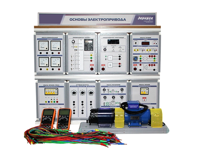 Лабораторный стенд "Основы электропривода" модульного настольного исполнения обеспечивает изучение систем управления электроприводом постоянного и переменного тока, генератора постоянного тока, двигателя постоянного тока, трехфазного асинхронного двигателя с короткозамкнутым ротором.