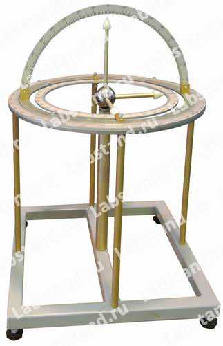 Модель позволяет демонстрировать углы прецессии, нутации и собственного вращения при повороте твердого тела вокруг неподвижной точки. Стенд состоит из основания и вертикальной стойки на которой на сферическом шарнире установлено твердое тело. Угол нутации может изменяться в пределах от -45° до +45°. На основании установлены подвижные угловые шкалы для измерения трех изучаемых углов.