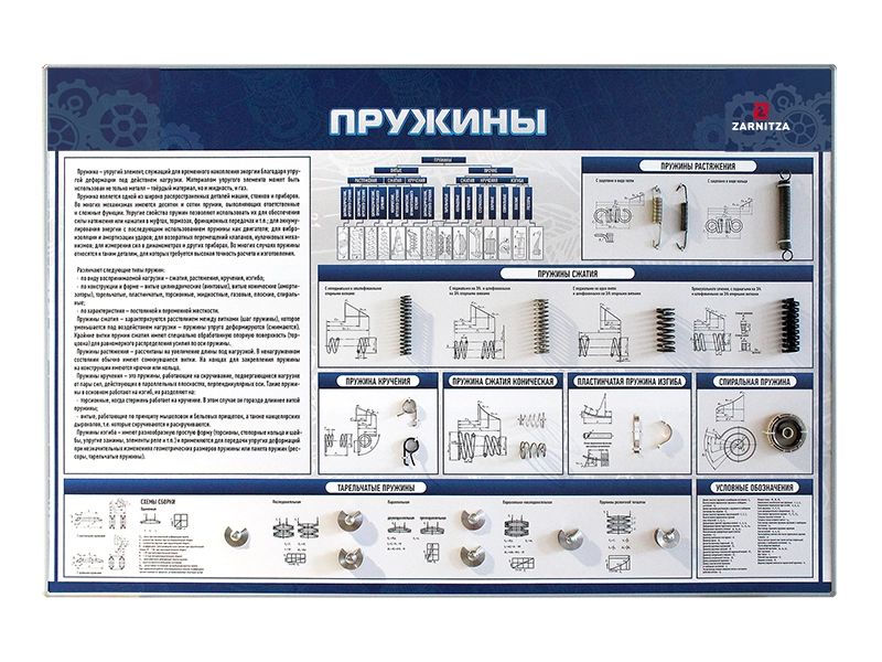 Стенд с макетными образцами "Пружины" представляет собой полноцветную информационную панель, на которой размещена справочная и графическая информация об основных геометрических параметрах пружин, приведены схемы и образцы пружин. Предназначен для наглядного изучения основных типов пружин учащимися специализированных учебных заведений.