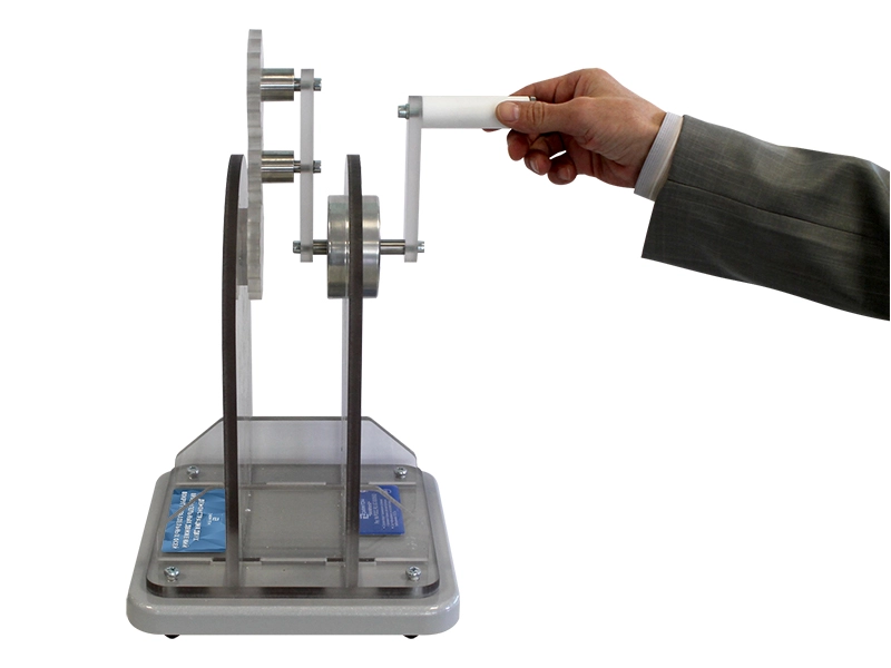 Лабораторный стенд представляет собой настольную конструкцию, приводимую в движение ручкой, при вращении которой происходит перемещение шестерен.