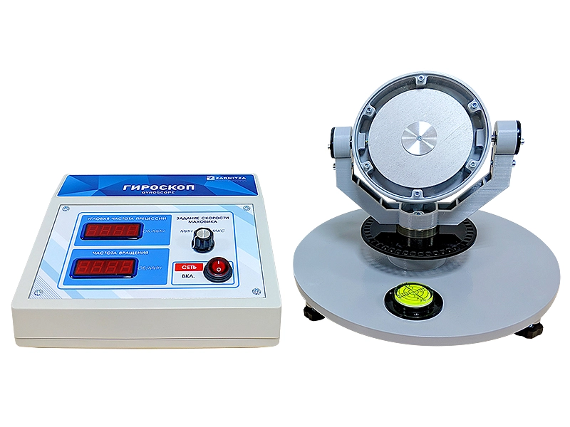 Лабораторный стенд наглядно иллюстрирует принцип работы гирокомпаса. Ось электродвигателя сохраняет первоначальное положение в пространстве при любых перемещениях основания. С помощью противовеса, установленного соосно оси вращения маховика, можно наблюдать и исследовать явление прецессии оси гироскопа под действием момента внешней силы, величина и направление которого легко изменяются перемещением противовеса вдоль оси. На стенде можно наблюдать изменения в характере движения при попытках принудительного вращения внешней рамки, а также реально ощутить возникновение и действие гироскопического момента.