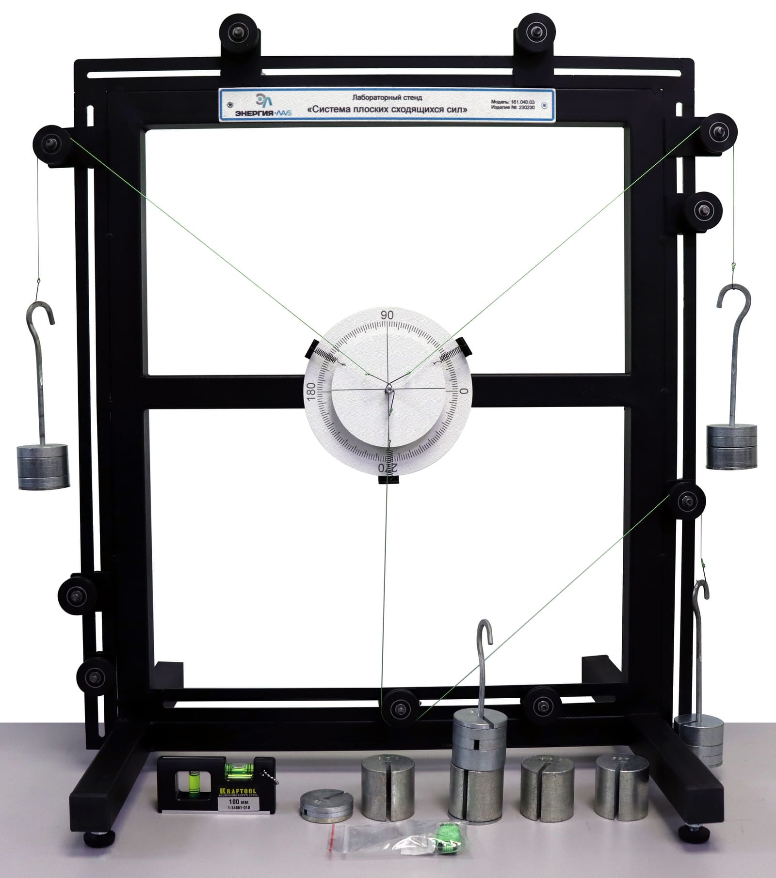 Учебное оборудование предназначено для проведения работ при изучении раздела «Теоретическая механика» курса технической механики. Учебный стенд позволяет изучить плоскую систему сходящихся сил и экспериментальным методом определить величину и направление равнодействующей силы.