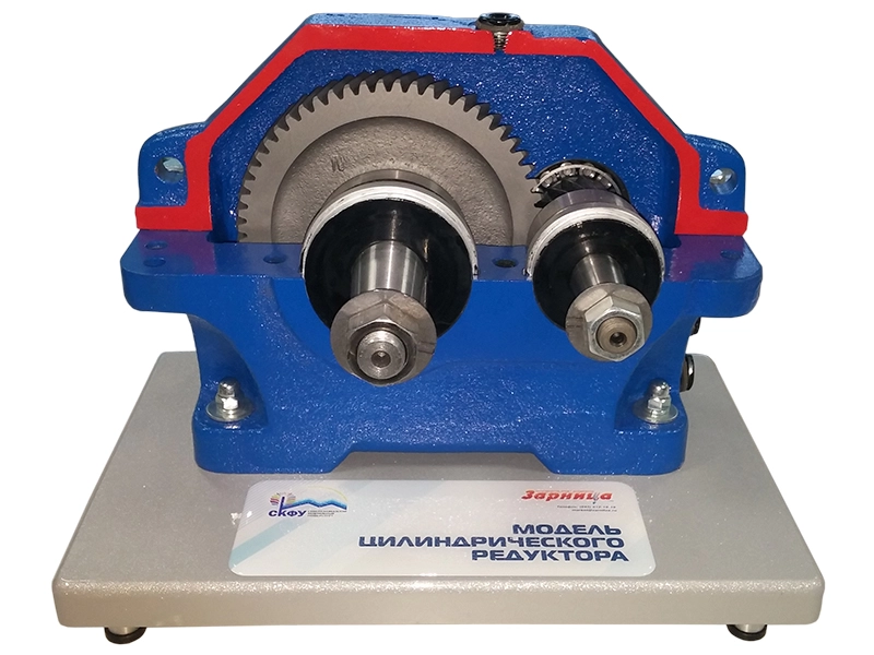 Модель на подставке предназначена для демонстрации принципа действия и конструкции цилиндрического редуктора, обеспечивает визуальное ознакомление с его элементами.