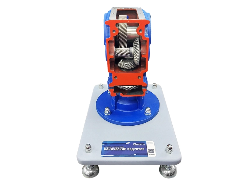 Модель на подставке представляет собой основание с закрепленным на нем коническим редуктором. На корпусе редуктора выполнен разрез, обеспечивающий визуальное ознакомление с его элементами.Оборудование может применяться в процессе обучения в учреждениях среднего и высшего профессионального образования для получения базовых и углубленных знаний и навыков по курсу "Прикладная механика".Модель на подставке предназначена для демонстрации принципа действия и конструкции конического редуктора, обеспечивает визуальное ознакомление с его элементами.