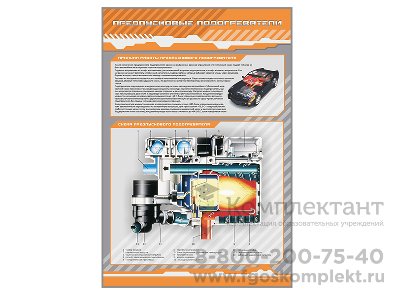 Стенд представляет собой информационную панель, на которой размещены сведения о предпусковых подогревателях.
