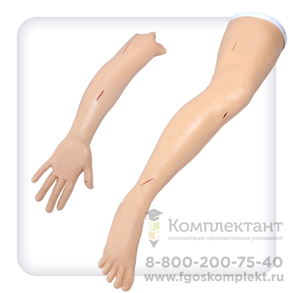 Комплект представляет собой модели нижней и верхней конечностей и предназначен для освоения практики наложения и снятия хирургических швов. Материал тренажеров по своим физикальным свойствам имитирует кожу человека, что способствует устойчивости к разрывным нагрузкам при стягивании шовным материалом и реалистичные ощущения при прокалывании иглой. Модели воспроизводят текстуру кожи, включая морщины и поры. На нижней конечности в области бедра и голени, а также на верхней – в области плеча и предплечья, размещены раневые дефекты для ушивания. Предусмотрено самостоятельное нанесение ран и порезов.