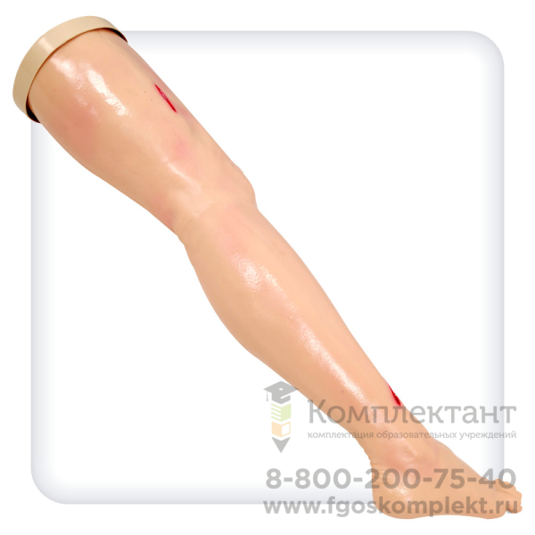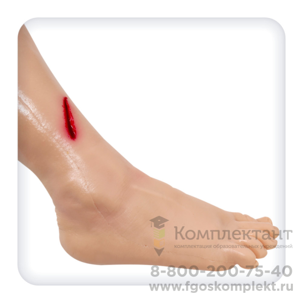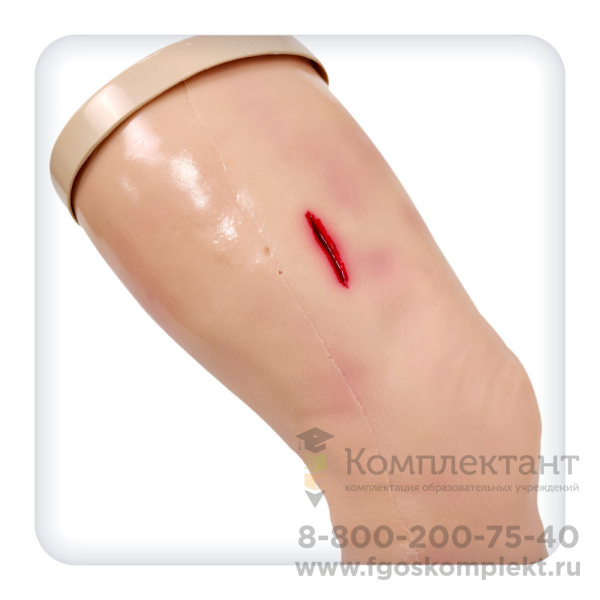 Модель представляет собой нижнюю конечность человека в натуральную величину и предназначена для освоения практики наложения и снятия хирургических швов. Материал тренажера по своим физикальным свойствам напоминает кожу человека, что способствует устойчивости к разрывным нагрузкам при стягивании шовным материалом и реалистичные ощущения при прокалывании иглой. Модель воспроизводит текстуру кожи, включая морщины и поры. На нижней конечности в области бедра и голени размещены раневые дефекты для ушивания. Предусмотрено самостоятельное нанесение ран и порезов.