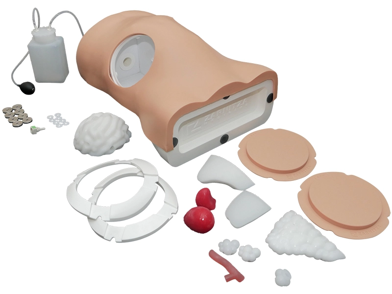 Две съемные подушечки для отработки лапароцентеза тканей передней брюшной стенки обеспечивают реалистичное сопротивление тканей под иглой.