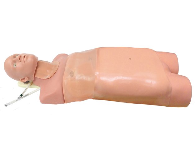 Торс взрослого мужчины выполнен с анатомической точностью и предназначен для отработки хирургических навыков при различных травмах, например, крикотиреоидотомии, чрескожной трахеостомии, пункционной аспирации иглой при пневмотораксе, введении грудной дренажной трубки, перикардиоцентеза, диагностического промывания брюшины, оперативного доступа к венам.