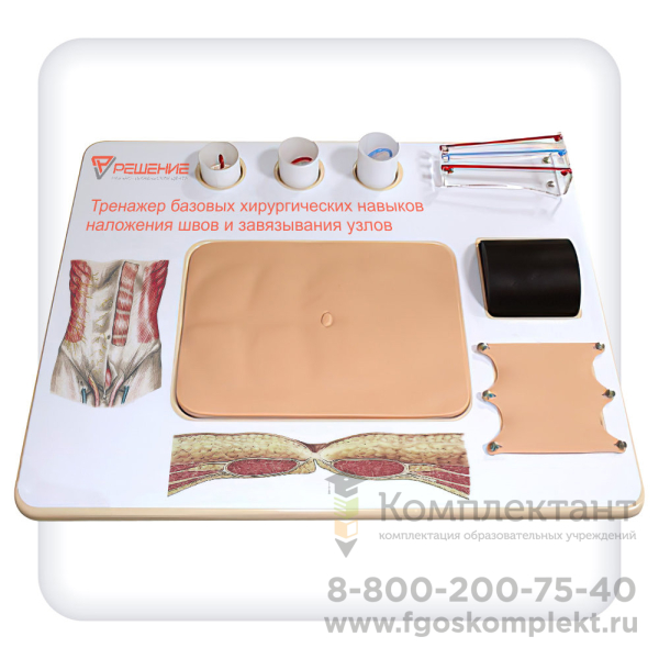 Тренажер представляет собой базовую платформу, с интегрированными фиксаторами и приспособлениями для установки сменных материалов имитирующих ткани тела человека для отработки следующих базовых хирургических навыков: