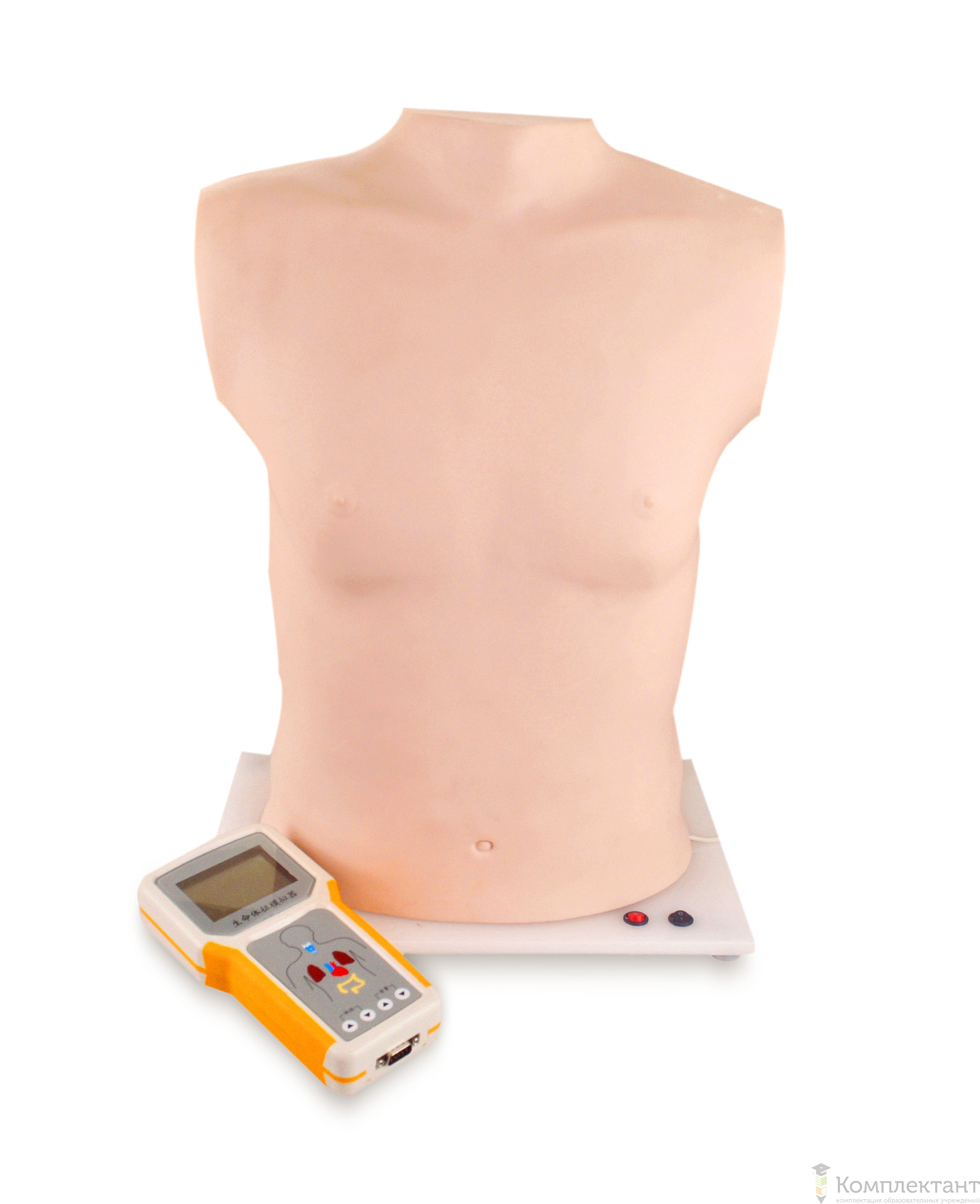 Тренажер для обучения аускультации и пальпации представляет собой торс взрослого человека, установленный на подставку.