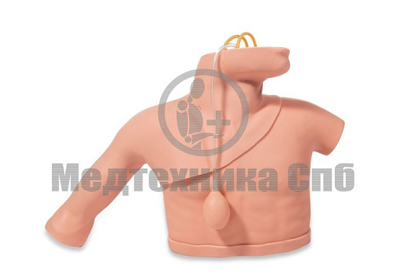 1. Тренажёр имитирует правую половину туловища взрослого человека с правой рукой. Имеются чёткие анатомические ориентиры: ключица, надъяремная вырезка, грудино-ключично-сосцевидная мышца, большая грудная мышца и дельтовидная мышца.