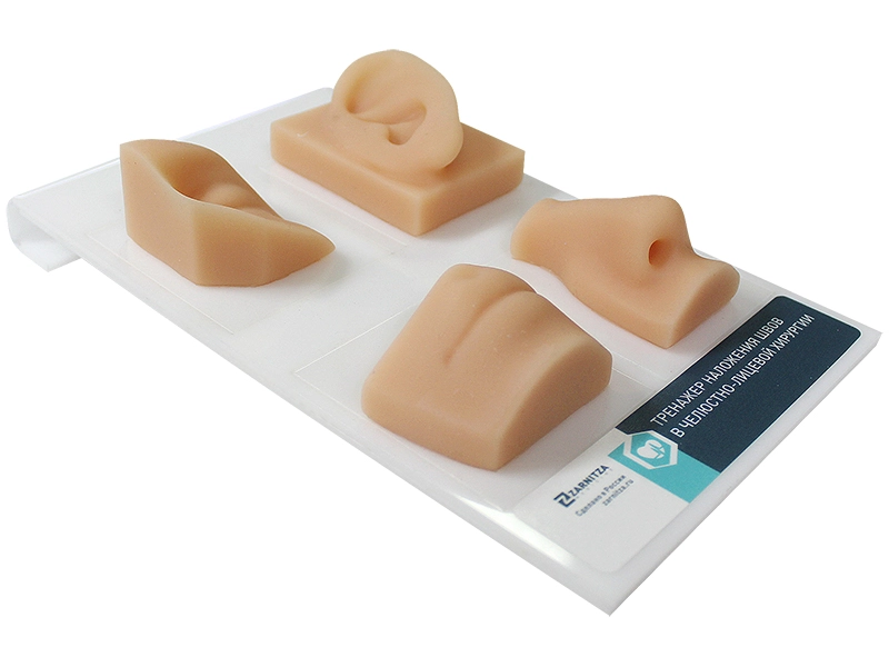 Тренажер представляет собой 4 анатомические модели, воспроизводящие области лицевого отдела головы (ушная, область носа, область губ, глазничная). Модели имеют плотную рельефную основу. Использованные материалы позволяют имитировать раны в указанных областях с последующей их обработкой и ушиванием. Тренажер позволяет освоить следующие навыки: