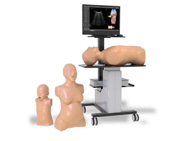 • Манекен мужского пола работает с модулями трансторакальной Эхо-КГ, трансабдоминальным и чреспищеводной Эхо-КГ; манекен женского пола работает с модулями «УЗД в акушерстве и гинекологии», «УЗД во 2-м триместре беременности» (необходимо использование дополнительной накладки на брюшную полость); манекен ребенка для модулей УЗИ брюшной полости, eFAST, прикроватное эхо, расширенное эхо и УЗИ лёгких.