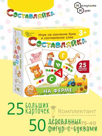 Детская деревянная игра Составляйка. На ферме, 25 карточек, арт. 8525 Учимся читать и запоминать буквы вместе с игрой \"Составляйка\". Игра сортер разработана специально для детей от 3х лет. Задача для малышей - подобрать по форме и цвету буквы алфавита, разложить их в порядке как на картинке и прочитать получившиеся слово. Варианты игры: сортировать буквы по цветам и формам, составлять слова, изучать алфавит и так далее. Проведите время с пользой вместе с ребенком. В набор входят: тематические карточки-шифры с картинками (25 штук), деревянные буквы разных цветов и форм (50 штук). Комплекты карточек могут быть использованы как раздаточный материал для проведения индивидуальных и групповых занятий в детских садах, в начальных классах школы и дома.