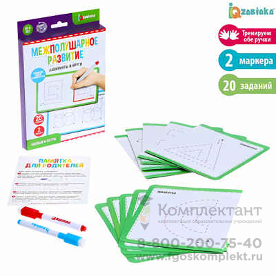 IQ-ZABIAKA Напиши и сотри Межполушарное развитие лабиринты и круги, арт. 6834643 С набором пиши-стирай «Межполушарное развитие» ребёнок научится рисовать двумя руками одновременно. Игра способствует развитию обоих полушарий мозга в равной степени. Разные цвета маркеров помогут ребёнку облегчить зрительный контроль над действиями на карточках. Начало движения отмечено на точках, а направления линий показаны стрелочками. Цель игры — нарисовать двумя руками симметричные картинки. В комплекте малыш найдёт 2 маркера и карточки с интересными заданиями. Карточки имеют специальное покрытие, которое позволяет писать и стирать много раз. Играйте и развивайтесь вместе с IQ-ZABIAKA!