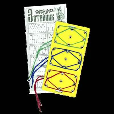 Пособие Воскобовича Шнур-затейник, арт. ЗНА-020 Описание: Продевая шнурок через кнопку и закрепляя его, ребенок \"вышивает\" узоры, цифры, буквы, слова, различные предметные силуэты по схеме, с помощью словесного диктанта или собственной фантазии. Состав: Игровое поле (240х130 мм, фанера, цветная пленка) с тремя рядами отверстий и закрепленными в них металлическими кнопками; 3 цветных шнурка; схемы узоров, цифр и слов; методика-сказка «Филимон Коттерфильд, знаменитый факир».