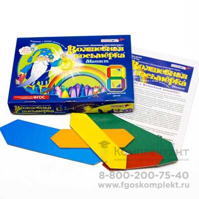 Волшебная восьмерка Магнит Конструктор в картонной коробке (их цветного картона): 3 набора по 10 разноцветных \"лепестков\" на магнитах трех размеров: красный, оранжевый, желтый, зеленый, голубой, синий, фиолетовый, белый, серый и черный. Развитие сенсорных способностей (цвет, форма), творческое конструирование, развитие моторики руки, формирование пространственных представлений, математических понятий. Возраст: 3-7 лет.