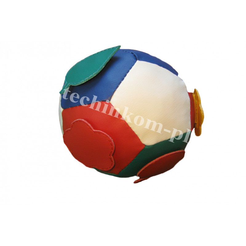 Мяч изготовлен из кусочков винилискожи в видепятигранников, набит поролоновой крошкой. На некоторых гранях нашитылипучки для крепления различных фигур: яблочко, листочек и т.п.