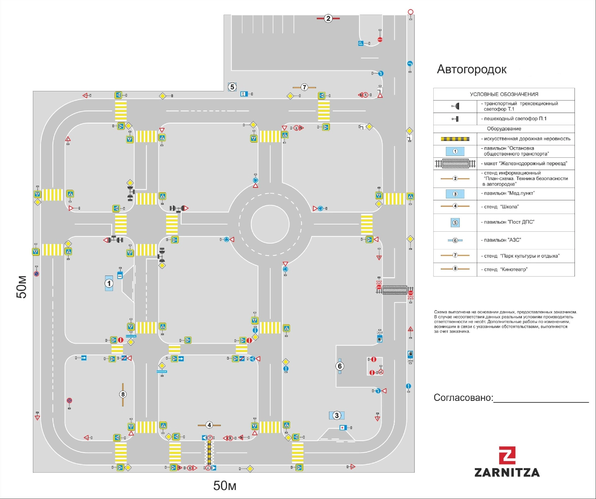 Автогородок - территория площадью от 1000 м2 (максимальная площадь не ограничена) с дорожной инфраструктурой (сеть проезжих частей, тротуаров и площадок для вождения) и техническими средствами организации дорожного движения (светофоры, шлагбаумы, дорожные знаки, дорожная разметка). Геометрические характеристики оборудования автогородка и ширина проезжих частей приняты согласно требованиям ГОСТ Р 52290-2004 «Технические средства организации дорожного движения. Знаки дорожные. Общие технические требования», ГОСТ Р 51256-99 «Технические средства организации дорожного движения. Разметка дорожная. Типы и основные параметры. Общие технические требования», ГОСТ Р 52282-2004 «Технические средства организации дорожного движения. Светофоры дорожные. Типы и основные параметры. Общие технические требования. Методы испытаний», ГОСТ Р 52289-2004 «Технические средства организации дорожного движения. Правила применения дорожных знаков, разметки, светофоров, дорожных ограждений и направляющих устройств» и пропорционально уменьшены в соответствии с антропометрическими данными детей, что улучшает видимость, понимание и правильное восприятие учащимися дорожной ситуации, а так же удобство в эксплуатации и обслуживании.