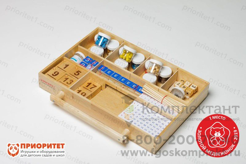Набор предназначен для детей старше 5 лет. В комплекте 270 элементов, которые подходят для обучения счету, решению примеров и простых задач. Для занятий необходима специальная математическая доска (есть в наборе).
