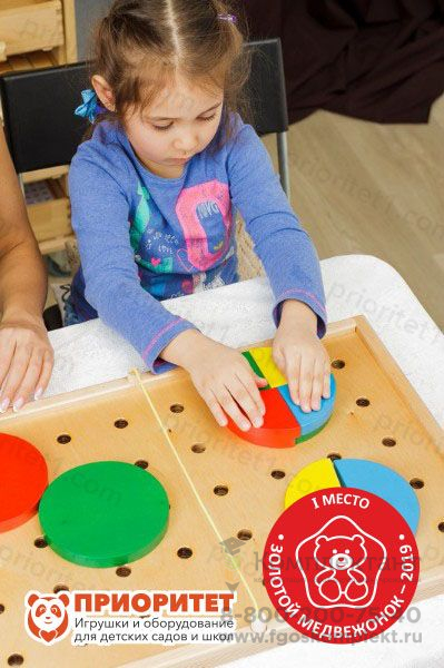 Для этого в модуле предусмотрены разнообразные крепления и фишки, из которых на игровой доске можно собрать разные конструкции. Детали соединяются при помощи натянутых на них цветных нитей или резинок.